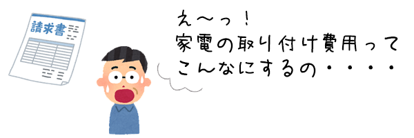 家電製品の取り付けのみを依頼した場合の費用は意外に高く、家電製品を安く買っても取り付け費用を含めたトータル費用で見ると却って割高になってしまうケースもありますので、家電購入の際は取り付け費用や購入後のアフターサービスまでを考慮しご検討されることをお勧めします。